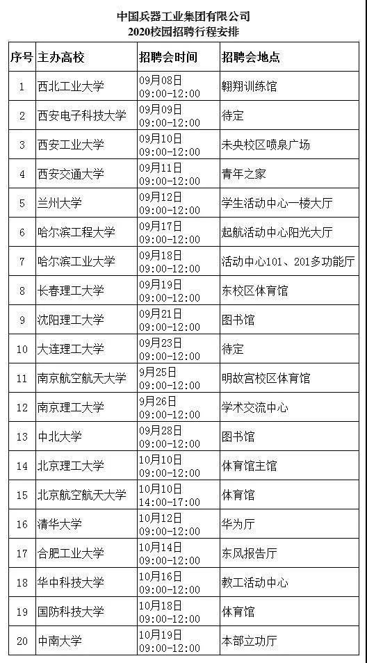 中國兵器工業(yè)集團(tuán) 2020校園招聘火熱來襲 只等你來哦 有夢(mèng)想的青年,請(qǐng)往下面看 讓我們攜手強(qiáng)軍報(bào)國 公司簡介 我們是我軍機(jī)械化、信息化、智能化裝備發(fā)展的骨干 我們是全軍毀傷打擊的核心支撐 我們是現(xiàn)代化新型陸軍體系作戰(zhàn)能力科研制造的主體 我們是國家“一帶一路”建設(shè)和軍民融合發(fā)展的主力 我們就是 中國兵器工業(yè)集團(tuán) 我們闊步邁進(jìn)世界一流防務(wù)集團(tuán) 資產(chǎn)總額3960億元 世界500強(qiáng)企業(yè)排名140 中國制造業(yè)企業(yè)排名第9 連續(xù)15年獲國資委經(jīng)營業(yè)績考核A級(jí) 招聘信息 面對(duì)2020年離開校園的你們,我們準(zhǔn)備了 >>職位:1500余個(gè) >>招聘人數(shù):3774人 >>專業(yè)涉及: 武器類 武器系統(tǒng)與發(fā)射工程,彈藥工程與爆炸技術(shù),探測(cè)制導(dǎo)與控制技術(shù)等 機(jī)械類 機(jī)械設(shè)計(jì)制造及其自動(dòng)化,車輛工程,工程力學(xué),機(jī)械電子工程等 電子類 電氣工程及其自動(dòng)化,電子信息工程,通信工程,儀器儀表工程等 材料類 金屬材料工程,材料成型及控制工程,高分子材料與工程,材料科學(xué)與工程等 計(jì)算機(jī)類 計(jì)算機(jī)科學(xué)與技術(shù),計(jì)算機(jī)系統(tǒng)結(jié)構(gòu),計(jì)算機(jī)軟件與理論,網(wǎng)絡(luò)工程等 經(jīng)管類 財(cái)務(wù)管理,工商管理,行政管理,人力資源管理,會(huì)計(jì)學(xué),審計(jì)學(xué)等 其他 環(huán)境與安全類,臨床醫(yī)學(xué),語言類,建筑學(xué),法學(xué),采礦工程,化學(xué)類等 行程安排 中國兵器工業(yè)集團(tuán)2020屆校園招聘會(huì)將在全國12個(gè)城市、20所高校舉辦,招聘會(huì)具體行程見下表: