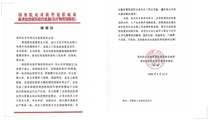 豫西集團(tuán)鄭州紅宇專汽公司收到國務(wù)院應(yīng)對新型冠狀病毒肺炎疫情聯(lián)防聯(lián)控機(jī)制醫(yī)療物資保障組發(fā)來的感謝信