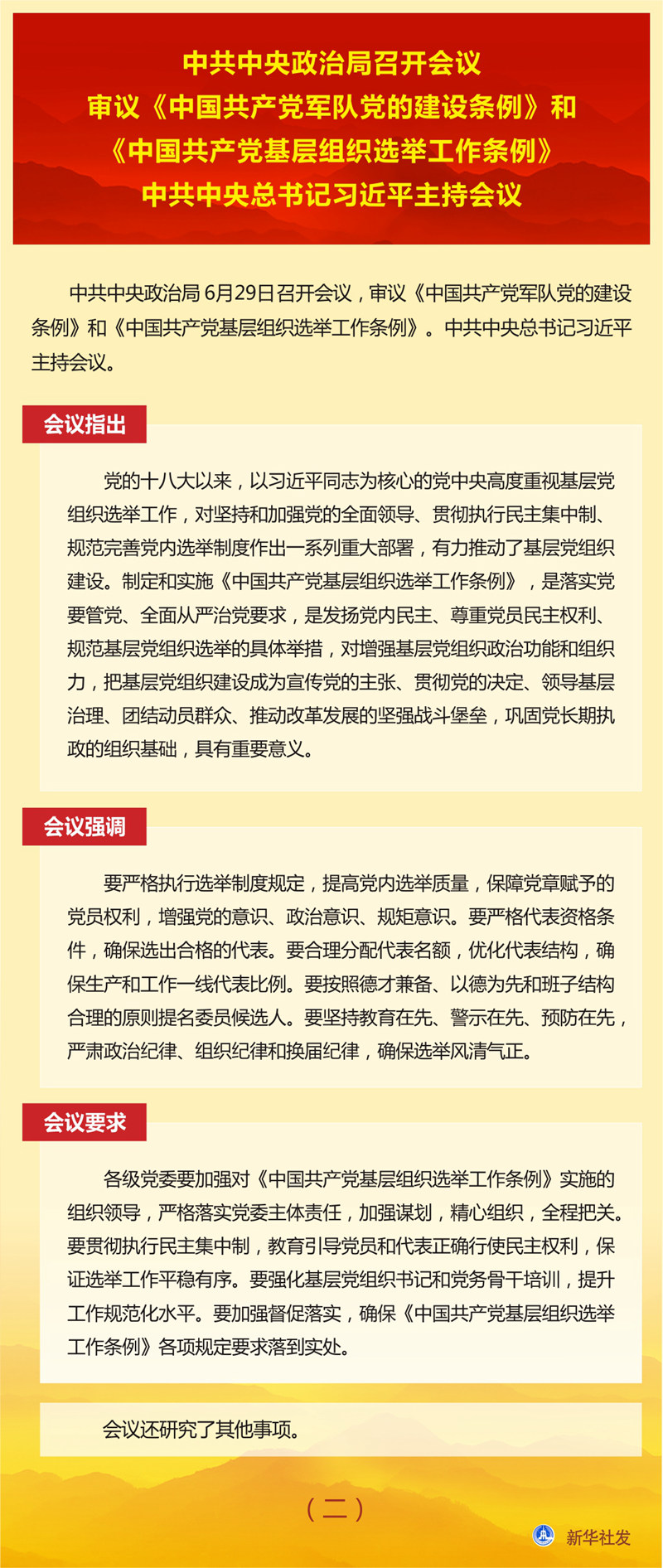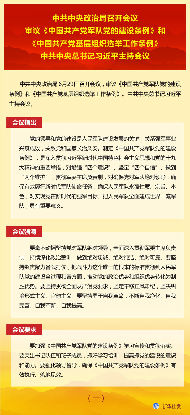中共中央政治局召開會(huì)議 審議《中國(guó)共產(chǎn)黨軍隊(duì)黨的建設(shè)條例》和《中國(guó)共產(chǎn)黨基層組織選舉工作條例》 中共中央總書記習(xí)近平主持會(huì)議 新華社北京6月29日電 中共中央政治局6月29日召開會(huì)議,審議《中國(guó)共產(chǎn)黨軍隊(duì)黨的建設(shè)條例》和《中國(guó)共產(chǎn)黨基層組織選舉工作條例》。中共中央總書記習(xí)近平主持會(huì)議。 會(huì)議指出,黨的領(lǐng)導(dǎo)和黨的建設(shè)是人民軍隊(duì)建設(shè)發(fā)展的關(guān)鍵,關(guān)系強(qiáng)軍事業(yè)興衰成敗,關(guān)系黨和國(guó)家長(zhǎng)治久安。制定《中國(guó)共產(chǎn)黨軍隊(duì)黨的建設(shè)條例》,是深入貫徹習(xí)近平新時(shí)代中國(guó)特色社會(huì)主義思想和黨的十九大精神的重要舉措,對(duì)增強(qiáng)“四個(gè)意識(shí)”、堅(jiān)定“四個(gè)自信”、做到“兩個(gè)維護(hù)”,貫徹軍委主席負(fù)責(zé)制,對(duì)確保黨對(duì)軍隊(duì)絕對(duì)領(lǐng)導(dǎo),確保有效履行新時(shí)代軍隊(duì)使命任務(wù),確保人民軍隊(duì)永葆性質(zhì)、宗旨、本色,對(duì)實(shí)現(xiàn)黨在新時(shí)代的強(qiáng)軍目標(biāo)、把人民軍隊(duì)全面建成世界一流軍隊(duì),具有重要意義。 會(huì)議強(qiáng)調(diào),要毫不動(dòng)搖堅(jiān)持黨對(duì)軍隊(duì)絕對(duì)領(lǐng)導(dǎo),全面深入貫徹軍委主席負(fù)責(zé)制,持續(xù)深化政治整訓(xùn),做到絕對(duì)忠誠(chéng)、絕對(duì)純潔、絕對(duì)可靠。要堅(jiān)持聚焦聚力備戰(zhàn)打仗,把戰(zhàn)斗力這個(gè)唯一的根本的標(biāo)準(zhǔn)貫徹到人民軍隊(duì)黨的建設(shè)全過程和各方面,推動(dòng)黨的政治優(yōu)勢(shì)和組織優(yōu)勢(shì)轉(zhuǎn)化為制勝優(yōu)勢(shì)。要堅(jiān)持貫徹全面從嚴(yán)治黨要求,堅(jiān)定不移正風(fēng)肅紀(jì),堅(jiān)決糾治形式主義、官僚主義。要堅(jiān)持勇于自我革命,不斷自我凈化、自我完善、自我革新、自我提高。 會(huì)議要求,要加強(qiáng)《中國(guó)共產(chǎn)黨軍隊(duì)黨的建設(shè)條例》學(xué)習(xí)宣傳和貫徹落實(shí)。要突出書記隊(duì)伍和班子成員,抓好學(xué)習(xí)培訓(xùn),提高抓黨的建設(shè)的意識(shí)和能力。要強(qiáng)化領(lǐng)導(dǎo)督導(dǎo),確?!吨袊?guó)共產(chǎn)黨軍隊(duì)黨的建設(shè)條例》有效執(zhí)行、落地見效。 會(huì)議指出,黨的十八大以來,以習(xí)近平同志為核心的黨中央高度重視基層黨組織選舉工作,對(duì)堅(jiān)持和加強(qiáng)黨的全面領(lǐng)導(dǎo)、貫徹執(zhí)行民主集中制、規(guī)范完善黨內(nèi)選舉制度作出一系列重大部署,有力推動(dòng)了基層黨組織建設(shè)。制定和實(shí)施《中國(guó)共產(chǎn)黨基層組織選舉工作條例》,是落實(shí)黨要管黨、全面從嚴(yán)治黨要求,是發(fā)揚(yáng)黨內(nèi)民主、尊重黨員民主權(quán)利、規(guī)范基層黨組織選舉的具體舉措,對(duì)增強(qiáng)基層黨組織政治功能和組織力,把基層黨組織建設(shè)成為宣傳黨的主張、貫徹黨的決定、領(lǐng)導(dǎo)基層治理、團(tuán)結(jié)動(dòng)員群眾、推動(dòng)改革發(fā)展的堅(jiān)強(qiáng)戰(zhàn)斗堡壘,鞏固黨長(zhǎng)期執(zhí)政的組織基礎(chǔ),具有重要意義。 會(huì)議強(qiáng)調(diào),要嚴(yán)格執(zhí)行選舉制度規(guī)定,提高黨內(nèi)選舉質(zhì)量,保障黨章賦予的黨員權(quán)利,增強(qiáng)黨的意識(shí)、政治意識(shí)、規(guī)矩意識(shí)。要嚴(yán)格代表資格條件,確保選出合格的代表。要合理分配代表名額,優(yōu)化代表結(jié)構(gòu),確保生產(chǎn)和工作一線代表比例。要按照德才兼?zhèn)?、以德為先和班子結(jié)構(gòu)合理的原則提名委員候選人。要堅(jiān)持教育在先、警示在先、預(yù)防在先,嚴(yán)肅政治紀(jì)律、組織紀(jì)律和換屆紀(jì)律,確保選舉風(fēng)清氣正。 會(huì)議要求,各級(jí)黨委要加強(qiáng)對(duì)《中國(guó)共產(chǎn)黨基層組織選舉工作條例》實(shí)施的組織領(lǐng)導(dǎo),嚴(yán)格落實(shí)黨委主體責(zé)任,加強(qiáng)謀劃,精心組織,全程把關(guān)。要貫徹執(zhí)行民主集中制,教育引導(dǎo)黨員和代表正確行使民主權(quán)利,保證選舉工作平穩(wěn)有序。要強(qiáng)化基層黨組織書記和黨務(wù)骨干培訓(xùn),提升工作規(guī)范化水平。要加強(qiáng)督促落實(shí),確?!吨袊?guó)共產(chǎn)黨基層組織選舉工作條例》各項(xiàng)規(guī)定要求落到實(shí)處。 會(huì)議還研究了其他事項(xiàng)。 |