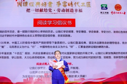 全國(guó)勞動(dòng)模范、兵器工業(yè)集團(tuán)北方車輛集團(tuán)職工馬小光宣讀參加“把一切獻(xiàn)給黨·勞動(dòng)創(chuàng)造幸?!比珖?guó)職工黨史學(xué)習(xí)教育讀書活動(dòng)倡議書