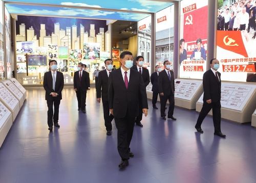 新近落成的中國(guó)共產(chǎn)黨歷史展覽館巍然矗立,氣勢(shì)恢宏。下午3時(shí)20分許,習(xí)近平等黨和國(guó)家領(lǐng)導(dǎo)同志來(lái)到這里,步入展廳參觀展覽。展覽以“不忘初心、牢記使命”為主題,精心設(shè)計(jì)了“建立中國(guó)共產(chǎn)黨 奪取新民主主義革命偉大勝利”、“成立中華人民共和國(guó) 進(jìn)行社會(huì)主義革命和建設(shè)”、“實(shí)行改革開(kāi)放 開(kāi)創(chuàng)和發(fā)展中國(guó)特色社會(huì)主義”、“推進(jìn)中國(guó)特色社會(huì)主義進(jìn)入新時(shí)代 全面建成小康社會(huì) 開(kāi)啟全面建設(shè)社會(huì)主義現(xiàn)代化國(guó)家新(人民日?qǐng)?bào))征程”4個(gè)部分,通過(guò)2600余幅圖片、3500多件套文物實(shí)物,第一次全方位、全過(guò)程、全景式、史詩(shī)般展現(xiàn)中國(guó)共產(chǎn)黨波瀾壯闊的百年歷程,濃墨重彩地反映黨的不懈奮斗史、不怕?tīng)奚贰⒗碚撎剿魇?、為民造福史、自身建設(shè)史,使人們深刻認(rèn)識(shí)到紅色政權(quán)來(lái)之不易、新中國(guó)來(lái)之不易、中國(guó)特色社會(huì)主義來(lái)之不易,深刻認(rèn)識(shí)到中國(guó)共產(chǎn)黨為什么能、馬克思主義為什么行、中國(guó)特色社會(huì)主義為什么好。