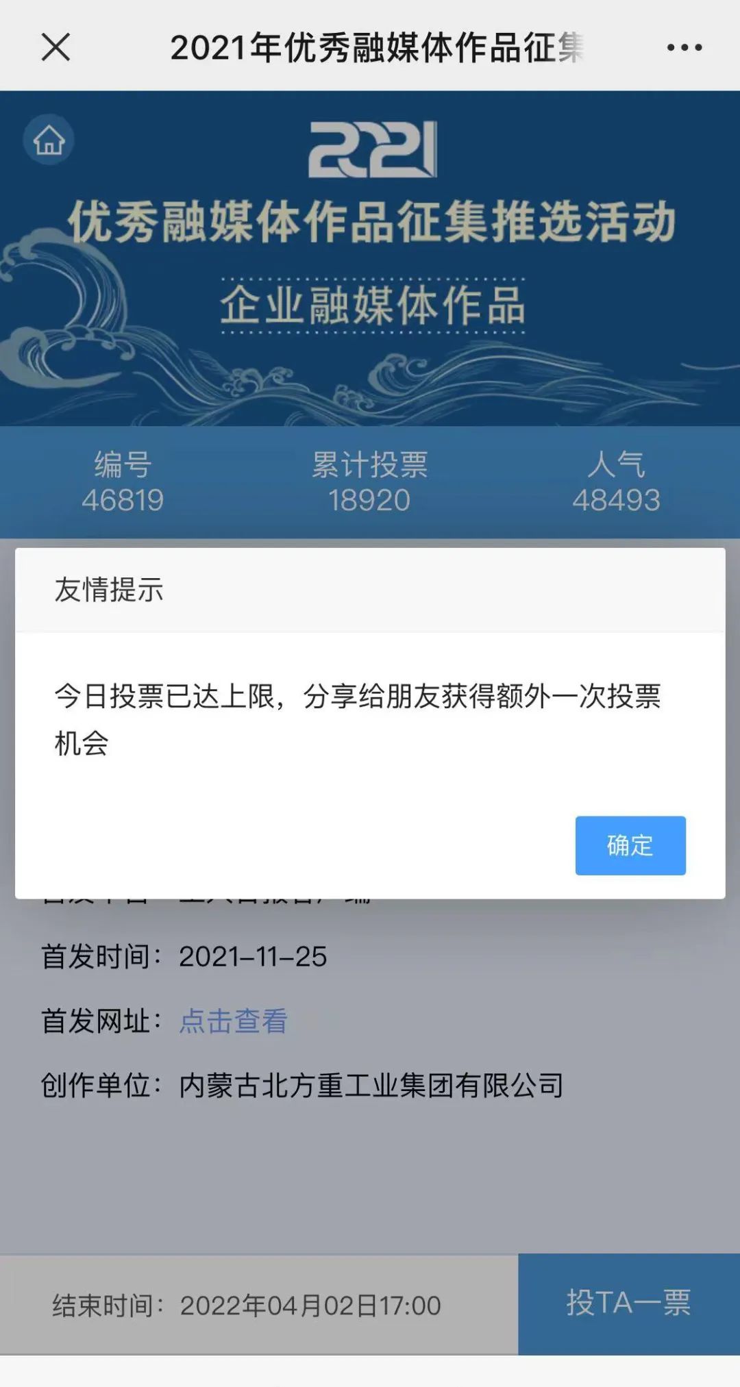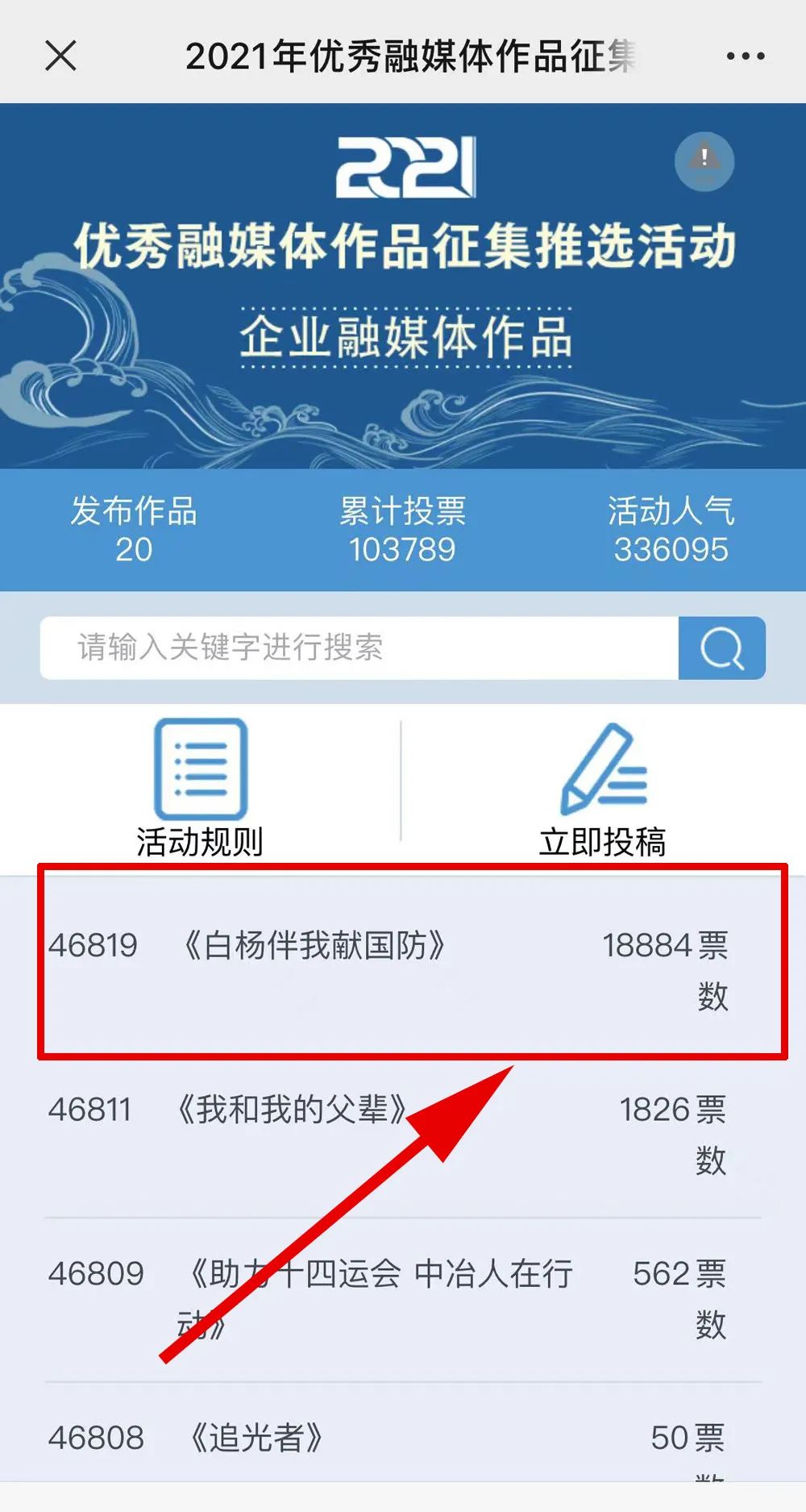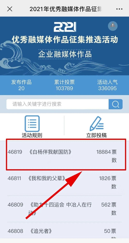 1.掃描下方二維碼,進入初始界面,點擊“企業(yè)融媒體作品征集”,進入投票界面點擊《白楊伴我獻國防》,點擊“投TA一票”;